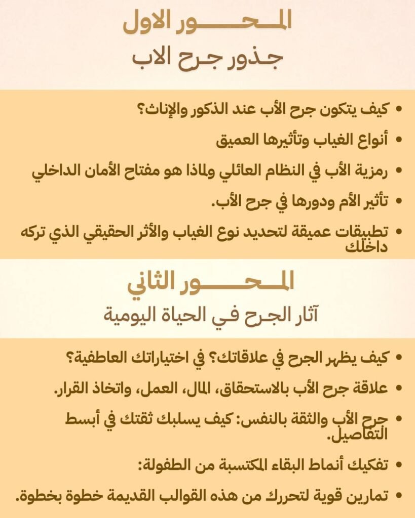 إذا لمست هذه الأسئلة شيئًا داخلك، فهذا البرنامج صُمم خصيصًا لك لأنه لا يعالج السلوك الخارجي فقط، بل يصل إلى الجذور العميقة لجرح الأب الذي يوجه حياتك دون وعي.